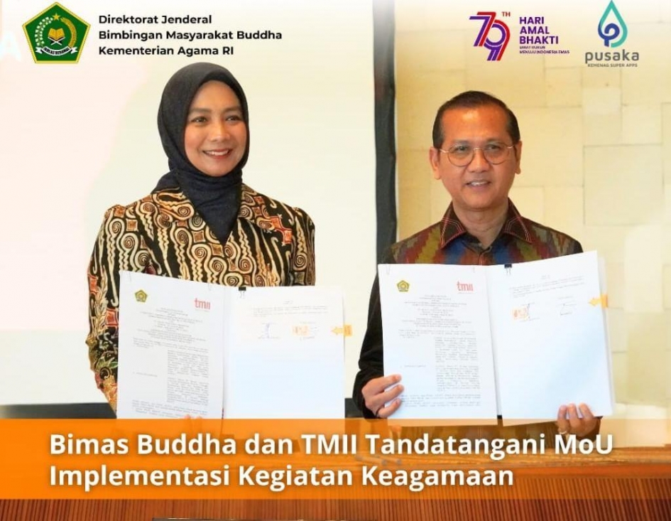 Jakarta (Bimas Buddha) --------- Direktur Jenderal Bimbingan Masyarakat Buddha, Supriyadi bersama Direktur Utama Taman Mini Indonesia Indah (TMII), Intan Ayu Kartika menandatangani MoU Nota Kesepahaman terkait Implementasi Kegiatan Keagamaan.