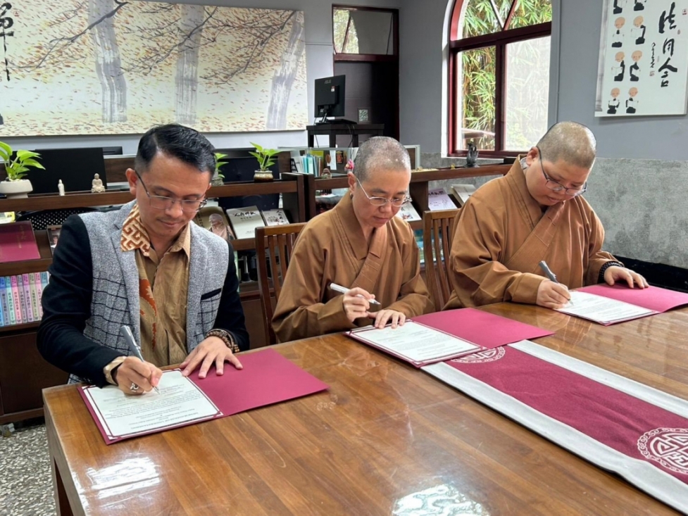 Jakarta (Bimas Buddha) ----- Dalam suasana penuh ketenangan dan welas asih pada Hari Besar Avalokitesvara Bodhisattva, dunia pendidikan Buddhis Indonesia mengukir momentum bersejarah melalui penandatanganan Nota Kesepahaman (MoU) antara Ketua Sekolah Tinggi Agama Buddha Negeri (STABN) Raden Wijaya, Dr. Sulaiman, M.Pd., Ph.D., dengan Sefu Miao Nan dari Fo Guang Shan Tsunglin University, Taiwan, dan Ketua Pusat PPBFGS Indonesia, Sefu Ru Yun, yang secara resmi menjalin kerjasama internasional dengan Fo Guang Shan Tsunglin University, Taiwan, serta Pusat Pendidikan Buddhis Fo Guang Shan Indonesia.